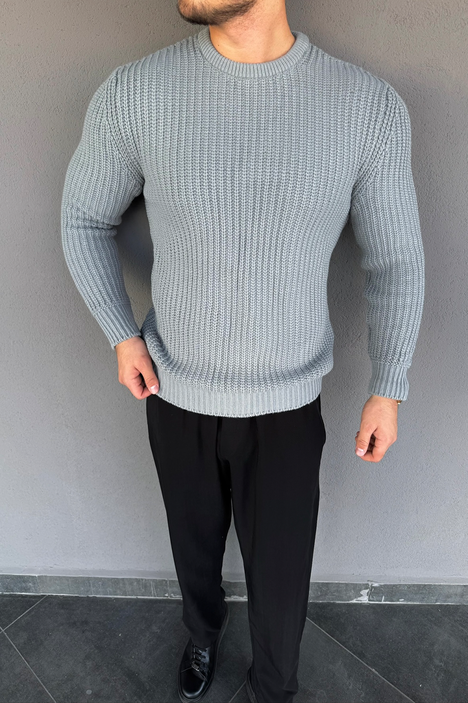 GRİ SELANİK ÖRME TAM KALIP KAZAK